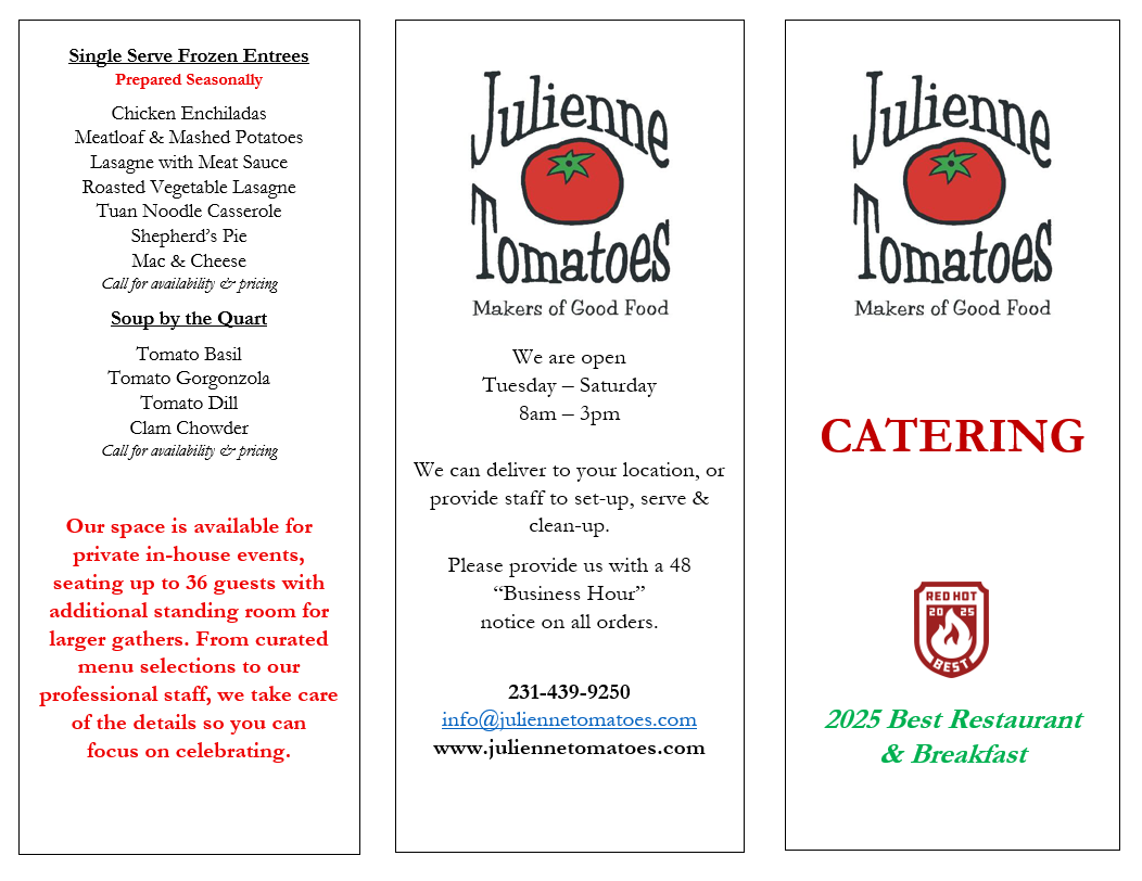 Julienne Tomatoes has been voted the Best Caterer in Northern Michigan multiple times and is ready to provide you the Hors d’oeuvres and food you will love!